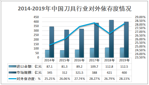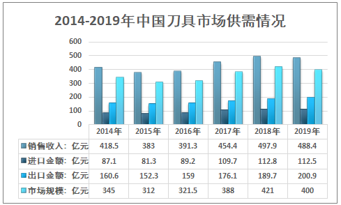2019年我国刀具行业销售收入约488.4亿元。刀具市场总消费规模400亿元,进口刀具112.5亿元;刀具出口200.9亿元。