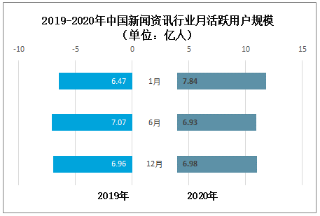 2020年1月中国新闻资讯行业月活跃用户规模7.84亿人,较2019年同期增长1.37亿人;2月中国新闻资讯行业月活跃用户规模6.93亿人,较2019年同期减少0.14亿人;12月中国新闻资讯行业月活跃用户规模6.98亿人,较2019年同期增长0.02亿人。