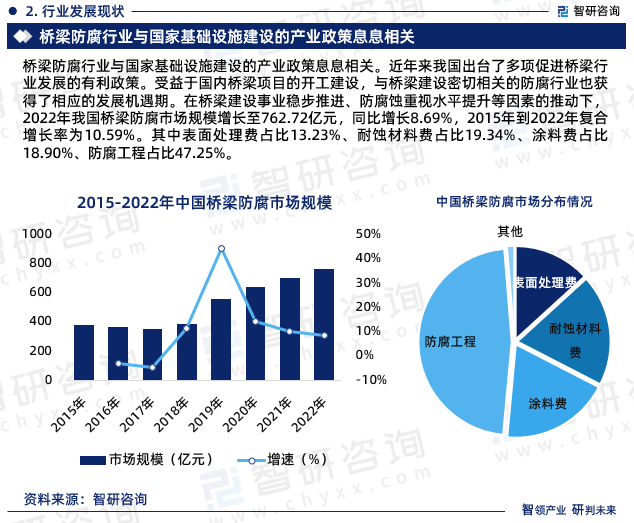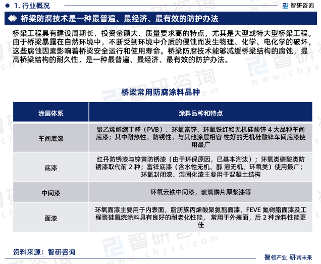 为方便行业人士或投资者更进一步了解桥梁防腐行业现状与前景,智研咨询特推出《2024-2030年中国桥梁防腐行业市场发展潜力及投资前景分析报告》(以下简称《报告》)。报告对中国桥梁防腐市场做出全面梳理和深入分析,是智研咨询多年连续追踪、实地走访、调研和分析成果的呈现。