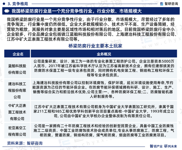 我国桥梁防腐行业是一个充分竞争性行业,由于行业分散、市场规模大,尽管经过了多年的竞争淘汰,行业集中度仍然很低。企业大多数规模较小、技术水平不高、生产设备简陋,经营较为粗放,其服务对象主要是区域性市场和相对落后的地区。目前我国桥梁防腐行业中小企业较多,行业品牌企业包括镇江蓝舶科技股份有限公司、上海建冶科技工程股份有限公司、江苏中矿大正表面工程技术有限公司等。