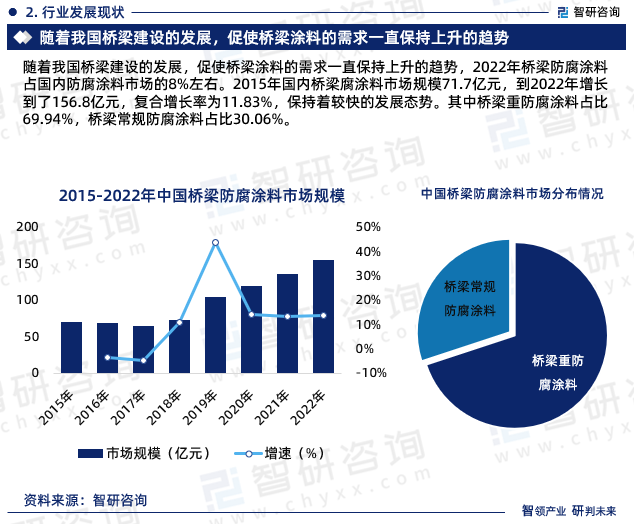 随着我国桥梁建设的发展,促使桥梁涂料的需求一直保持上升的趋势,2022年桥梁防腐涂料占国内防腐涂料市场的8%左右。2015年国内桥梁腐涂料市场规模71.7亿元,到2022年增长到了156.8亿元,复合增长率为11.83%,保持着较快的发展态势。其中桥梁重防腐涂料占比69.94%,桥梁常规防腐涂料占比30.06%。