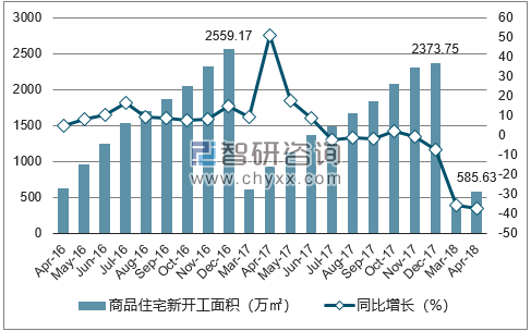 2018年1-4月成都市商品住宅新开工面积为585.63万㎡,同比下降37.5%;2017年1-12月成都市商品住宅新开工面积为2373.75万㎡,同比下降7.2%。