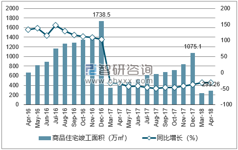 2018年1-4月成都市商品住宅竣工面积为293.26万㎡,同比下降32.2%;2017年1-12月成都市商品住宅竣工面积为1075.1万㎡,同比下降38.2%。