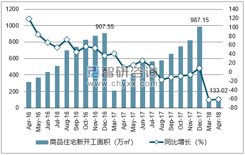 2018年1-4月昆明市商品住宅新开工面积为133.02万㎡,同比下降61.4%;2017年1-12月昆明市商品住宅新开工面积为987.15万㎡,同比增长8.8%。