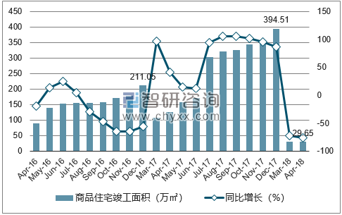 2018年1-4月昆明市商品住宅竣工面积为29.65万㎡,同比下降76.6%;2017年1-12月昆明市商品住宅竣工面积为394.51万㎡,同比增长86.9%。