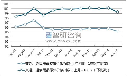 智研咨询数据显示:2018年6月黑龙江交通、通信用品零售价格指数本期数为95.21,本期累计数为95.66,环比数为99.3。