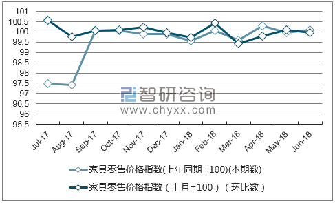 智研咨询数据显示:2018年6月黑龙江家具零售价格指数本期数为100.11,本期累计数为99.93,环比数为99.96。