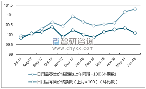 智研咨询数据显示:2018年6月贵州日用品零售价格指数本期数为101.31,本期累计数为100.78,环比数为100.09。