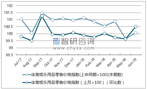 智研咨询数据显示:2018年6月福建体育娱乐用品零售价格指数本期数为100.06,本期累计数为100.52,环比数为100.51。
