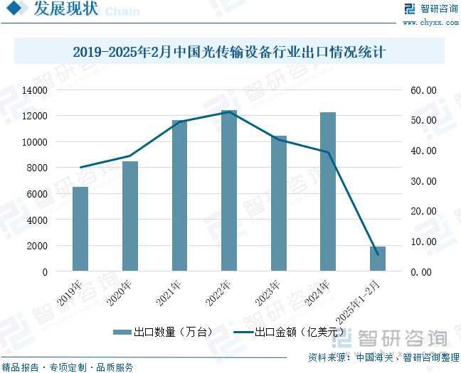 光传输设备行业是现代通信网络的重要组成部分,其核心在于将各种信号转换成光信号,并通过光纤进行长距离、低损耗地传输。近年来,随着5G、物联网、云计算等新兴技术的快速发展,对高速、大容量、低时延的光传输设备需求持续增长。与此同时,随着国内光缆网络持续扩展,光传输设备的应用场景不断丰富,市场规模稳步扩大。在充分满足国内市场需求的同时,我国光传输设备凭借技术优势和成本竞争力,在国际市场上也占据重要地位。中国海关数据显示,2024年中国光传输设备出口量为12281.5万台,同比增长17.22%;出口金额为39.32亿美元,同比下降9.52%。2025年1-2月,中国光传输设备出口量为1915.27万台,同比增长12.48%;出口金额为5.51亿美元,同比下降5.56%。未来,随着“东数西算”等国家战略的深入实施,以及硅光技术、相干传输等前沿领域的持续突破,我国光传输设备产业有望实现从规模扩张向质量提升的战略转型,在全球价值链中占据更有利位置。