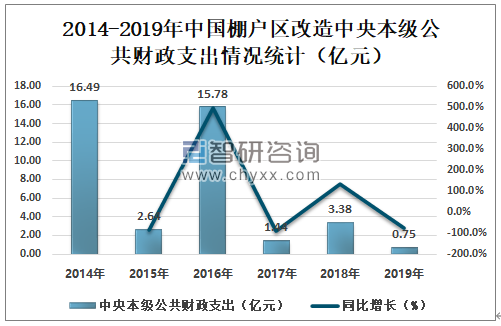 2018年中国棚户区改造中央本级公共财政支出为3.38亿元,同比增长134.7%;2019年中国棚户区改造中央本级公共财政支出为0.75亿元,同比减少77.8%。