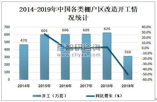 2014-2018年中国各类棚户区改造开工逐年增加,2018年中国各类棚户区改造开工626万套,同比增长2.8%,2019年较2018年有所回落,2019年中国各类棚户区改造开工316万套,同比减少49.5%。