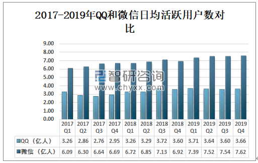 2017-2019年QQ和微信日均活跃用户数对比