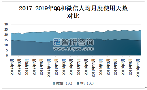 2017-2019年QQ和微信人均月度使用天数对比