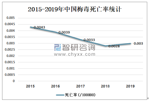 2015-2018年中国梅毒死亡率逐年下降,2018中国梅毒死亡率为0.0028/10万,较2017年减少了0.0005/10万,2019年较2018年有所增加,2019中国梅毒死亡率为0.003/10万,较2018年增长了0.0002/10万。