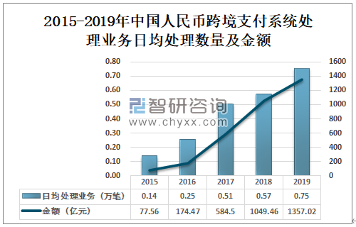2015-2019年中国人民币跨境支付系统处理业务日均处理数量及金额