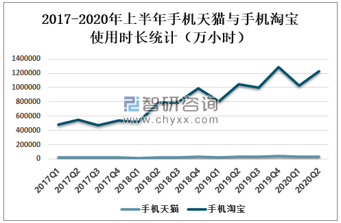 2017-2020年上半年手机天猫使用时长总体呈现上升趋势,2020二季度手机天猫使用时长为34399.4万小时,较2020年一季度增加了6199.40万小时。2017-2020年上半年手机淘宝使用时长总体呈现上升趋势,2020二季度手机淘宝使用时长为1225555.1万小时,较2020年一季度增加了200891.00万小时。