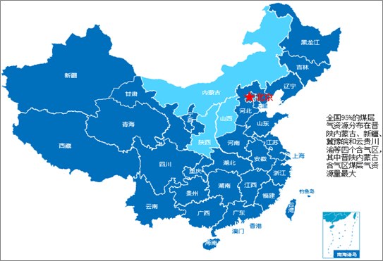 煤层气是煤层本身自生自储式的非常规天然气,世界上有74个国家蕴藏着煤层气资源,中国煤层气资源量居世界第三位。全国95%的煤层气资源分布在晋陕内蒙古、新疆、冀豫皖和云贵川渝等四个含气区,其中晋陕内蒙古含气区煤层气资源量最大。