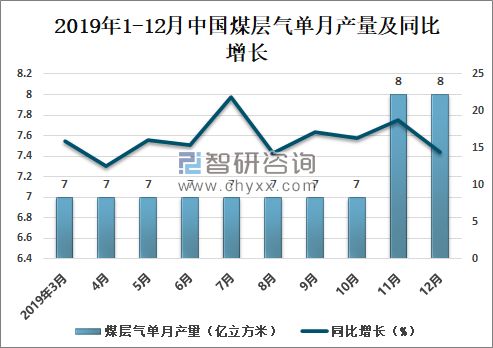 煤层气勘探开发是世界上发展较快的非常规天然气产业,我国煤层气资源丰富,居世界第三。2019年1-12月中国煤层气单月产量呈平稳增长趋势,2019年11月煤层气单月产量8亿立方米,同比增长18.8%;2019年12月煤层气单月产量8亿立方米,同比增长14.5%。