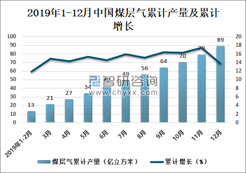 煤层气是高效洁净能源,是能源行业中发展空间巨大的新兴产业之一。2019年1-12月中国煤层气累计产量呈波动趋势,2019年1-11月中国煤层气累计产量79亿立方米,累计增长17.5%;2019年1-12月中国煤层气累计产量89亿立方米,累计增长13.8%。