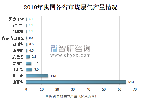 智研咨询发布的《2020-2026年中国煤层气行业市场发展规模及投资前景趋势报告》数据显示:2019年山西煤层气地面开发和利用量稳步增长,煤层气产量64.1亿立方米,增长25.2%;北京市、江苏省、贵州省、安徽省煤层气产量分别是14.1亿立方米、3.6亿立方米、3.2亿立方米、2.1亿立方米。