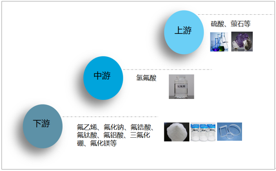 氢氟酸上游产品主要有硫酸、萤石等。下游产品主要有氟乙烯、氟化钠、氟锆酸、氟钛酸、氟铝酸、三氟化硼、氟化镁等。