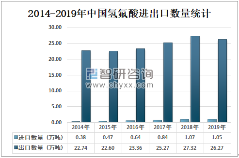 中国氢氟酸出口数量明显大于进口数量,2019年中国氢氟酸进口数量为1.05万吨,较2018年减少了0.02万吨;2019年中国氢氟酸出口数量为26.27万吨,较2018年减少了1.05万吨。