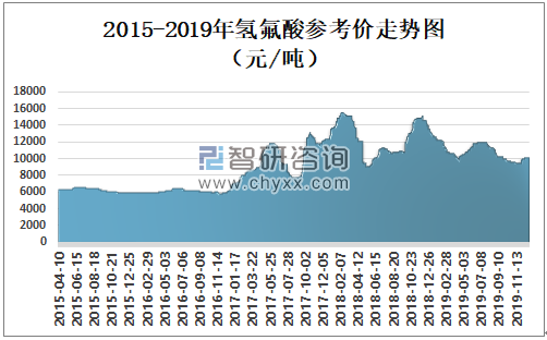 智研咨询发布的《2020-2026年中国氢氟酸行业市场现状调研及未来发展前景报告》数据显示:2019年年初氢氟酸参考价开始下滑,4月开始回升。2019年12月31日氢氟酸参考价为10240元/吨,较2019年1月1日减少了3385元/吨。