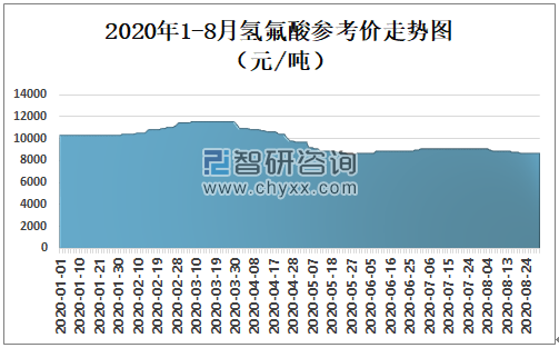 2020年1-8月氢氟酸参考价走势图(元/吨)