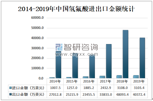 2019年中国氢氟酸进口金额为3103.4万美元,较2018年减少了4.587万美元;2019年中国氢氟酸出口金额为40372.4万美元,较2018年减少了7720.956万美元。