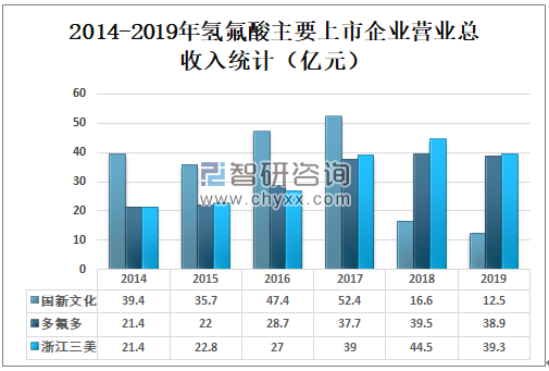 2019年国新文化营业总收入为12.5亿元,较2018年减少了4.1亿元;多氟多营业总收入为38.9亿元,较2018年减少了0.6亿元;浙江三美营业总收入为39.3亿元,较2018年减少了5.2亿元。