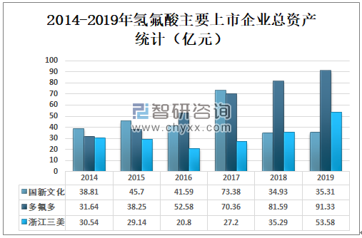 2019年国新文化总资产为35.31亿元,较2018年增长了0.38亿元;多氟多总资产为91.33亿元,较2018年增长了9.74亿元;浙江三美总资产为53.58亿元,较2018年增长了18.29亿元。