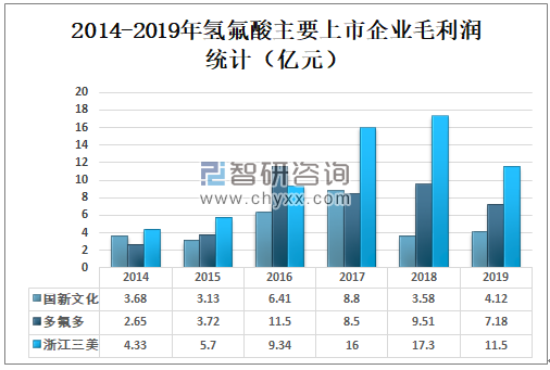 2019年国新文化毛利润为4.12亿元,较2018年增长了0.54亿元;多氟多毛利润为7.18亿元,较2018年减少了2.33亿元;浙江三美毛利润为11.5亿元,较2018年减少了5.8亿元。
