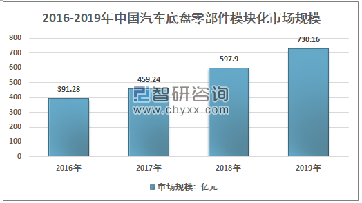 智研咨询发布的《2020-2026年中国汽车底盘零部件模块化行业市场现状分析及投资价值研究报告》显示,2019年我国汽车底盘零部件模块化市场规模730.16亿元,同比2018年的597.9亿元增长了22.12%。