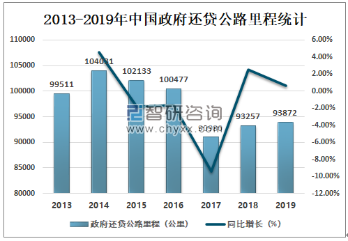 2017-2019年中国政府还贷公路里程逐年增加,2018年中国政府还贷公路里程为93257公里,较2017年增加了2277.30公里;2019年中国政府还贷公路里程为93872公里,较2018年增加了615.10公里。