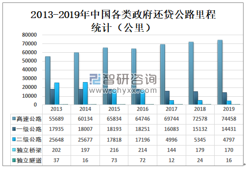智研咨询发布的《2020-2026年中国收费公路行业市场深度评估及投资决策建议分析报告》数据显示:2019年中国政府还贷性高速公路里程为74458公里,较2018年增加了1880公里;政府还贷性一级公路里程为14431公里,较2018年减少了701公里;政府还贷性二级公路里程为4797公里,较2018年减少了547公里;政府还贷性独立桥梁里程为170公里,较2018年减少了9公里;政府还贷性独立隧道里程为16公里,较2018年减少了8公里。