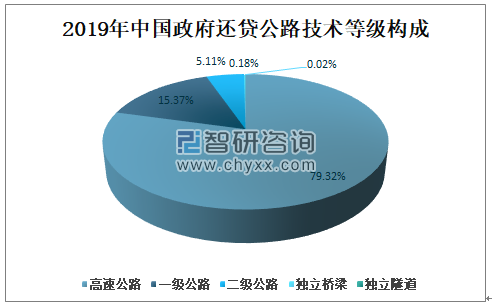 2019年中国政府还贷高速公路里程占全国政府还贷公路总里程的79.32%,占比最大;政府还贷一级公路占全国政府还贷公路总里程的15.37%;政府还贷二级公路占全国政府还贷公路总里程的5.11%;政府还贷独立桥梁占全国政府还贷公路总里程的0.18%;政府还贷独立隧道占全国政府还贷公路总里程的0.02%。