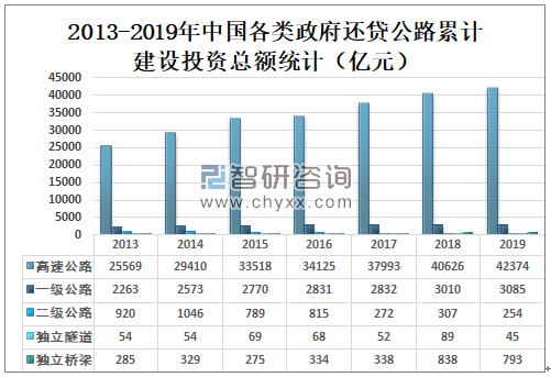 2019年中国政府还贷性高速公路建设投资总额为42374亿元,较2018年增加了1748亿元;政府还贷性一级公路建设投资总额为3085亿元,较2018年增加了75亿元;政府还贷性二级公路建设投资总额为254亿元,较2018年减少了53亿元;政府还贷性独立隧道建设投资总额为45亿元,较2018年减少了45亿元;政府还贷性独立桥梁建设投资总额为793亿元,较2018年减少了45亿元。