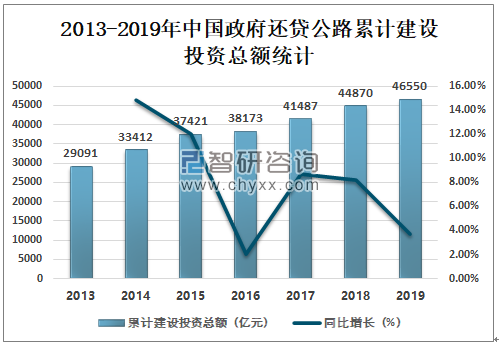 近年来中国政府还贷公路累计建设投资总额持续增长,2018年中国政府还贷公路累计建设投资总额为44870亿元,同比增长8.15%;2019年中国政府还贷公路累计建设投资总额为46550亿元,同比增长3.74%。