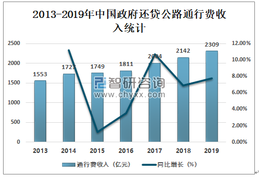 近年来中国政府还贷公路通行费收入持续增长,2018年中国政府还贷公路通行费收入为2142亿元,较2017年增加了137.82亿元;2019年中国政府还贷公路通行费收入为2309亿元,较2017年增加了166.74亿元。