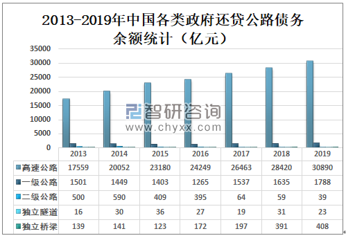 2019年中国政府还贷性高速公路债务余额为30890亿元,较2018年增加了2469亿元;政府还贷性一级公路债务余额为1788亿元,较2018年增加了153亿元;政府还贷性二级公路债务余额为39亿元,较2018年减少了20亿元;政府还贷性独立隧道债务余额为23亿元,较2018年减少了8亿元;政府还贷性独立桥梁债务余额为408亿元,较2018年增加了18亿元。