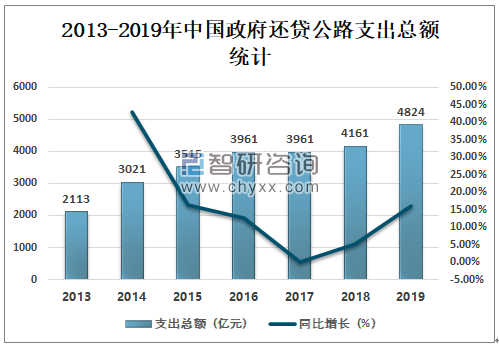2017-2019年中国政府还贷公路支出总额逐年增加,2018年中国政府还贷公路支出总额为4161亿元,较2017年增长了199.50亿元;2019年中国政府还贷公路支出总额为4824亿元,较2018年增长了663.11亿元。