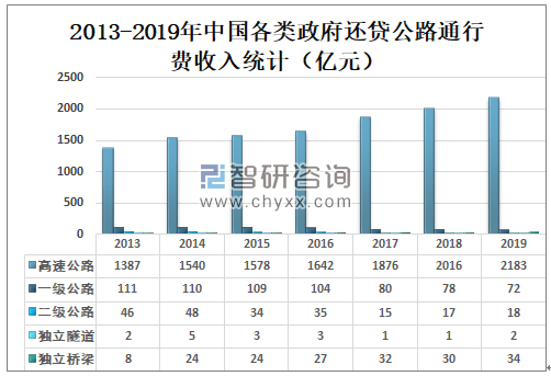 2019年中国政府还贷性高速公路通行费收入为2183亿元,较2018年增加了167亿元;政府还贷性一级公路通行费收入为72亿元,较2018年减少了6亿元;政府还贷性二级公路通行费收入为18亿元,较2018年增加了1亿元;政府还贷性独立隧道通行费收入为2亿元,较2018年增加了1亿元;政府还贷性独立桥梁通行费收入为34亿元,较2018年增加了4亿元。