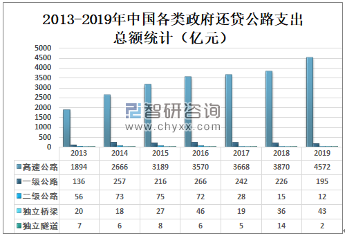2019年中国政府还贷性高速公路支出总额为4572亿元,较2018年增加了702亿元;政府还贷性一级公路支出总额为195亿元,较2018年减少了31亿元;政府还贷性二级公路支出总额为12亿元,较2018年减少了3亿元;政府还贷性独立桥梁支出总额为43亿元,较2018年增加了7亿元;政府还贷性独立隧道支出总额为2亿元,较2018年减少了12亿元。