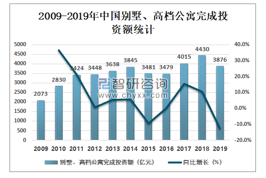 2009-2019年中国别墅、高档公寓完成投资额统计