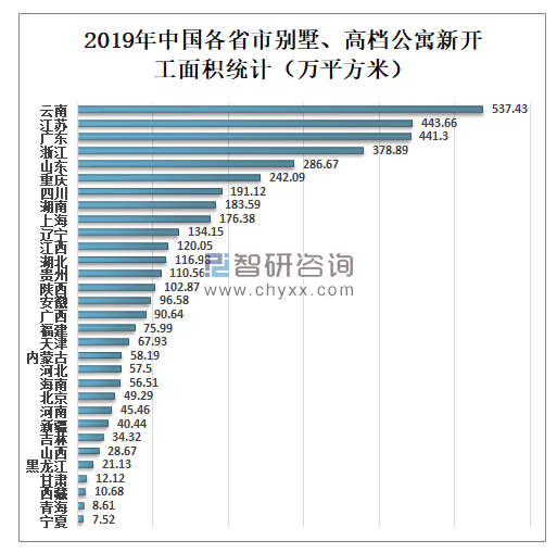 2019年云南别墅、高档公寓新开工面积为537.43万平方米,全国排名第一;江苏别墅、高档公寓新开工面积为443.66万平方米,全国排名第二;广东别墅、高档公寓新开工面积为441.3万平方米,全国排名第三。