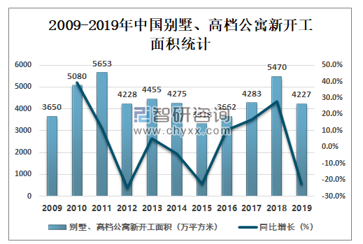 2015-2018年中国别墅、高档公寓新开工面积逐年增加,2018年中国别墅、高档公寓新开工面积为5470万平方米,较2017年增加了1187万平方米,2019年较2018年有所下滑,2019年中国别墅、高档公寓新开工面积为4227万平方米,较2018年减少了1243万平方米。