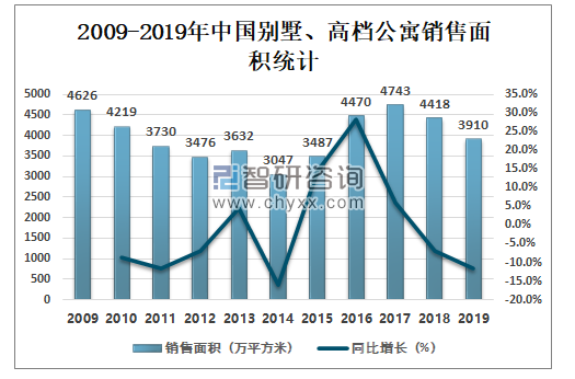 2009-2019年中国别墅、高档公寓新开工面积统计