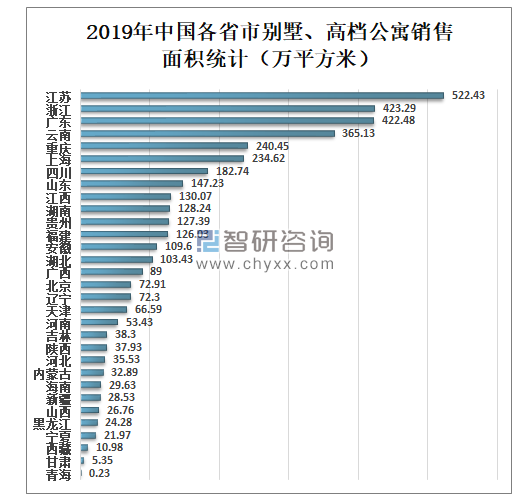 2019年江苏别墅、高档公寓销售面积为522.43万平方米,全国排名第一;浙江别墅、高档公寓销售面积为423.29万平方米,全国排名第二;广东别墅、高档公寓销售面积为422.48万平方米,全国排名第三。