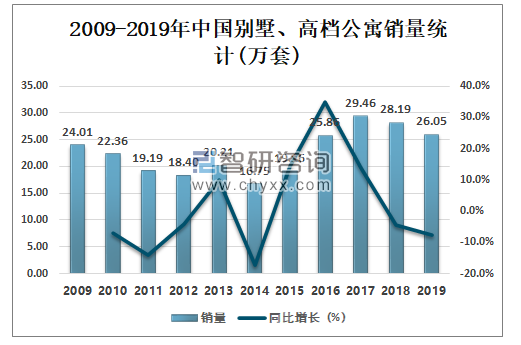 2017-2019年中国别墅、高档公寓销量逐年减少,2018年中国别墅、高档公寓销量为28.19万套,同比减少4.3%;2019年中国别墅、高档公寓销量为26.05套,同比减少7.6%。